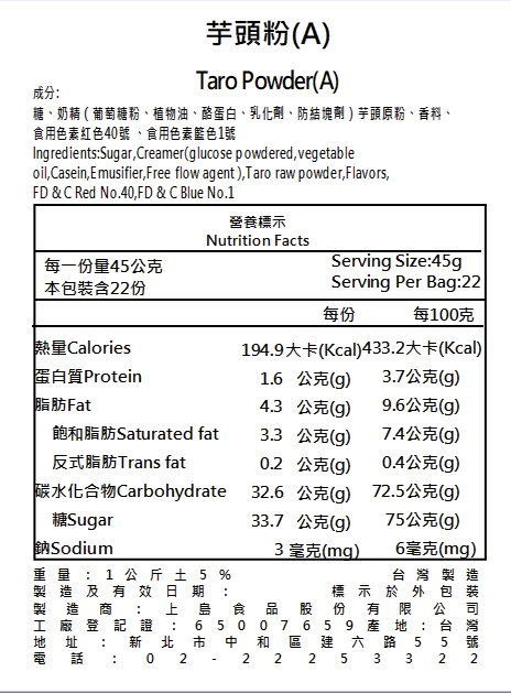 Shang Tong Food’s Taro Powder A contains over 20% taro powder, making it suitable for making milk tea, shaved ice, and creative custard sauce. It offers a delightful and rich flavor.